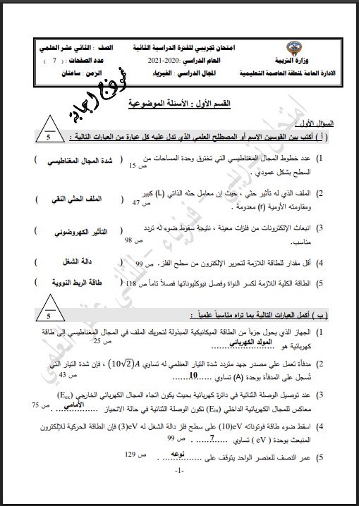 نقدم لكم في موقعنا رابط تحميل إجابة إمتحان تجريبي 2 فيزياء للصف الثاني عشر علمي الفصل الثاني للتحميل PDF الخاص بمناهج الكويت.