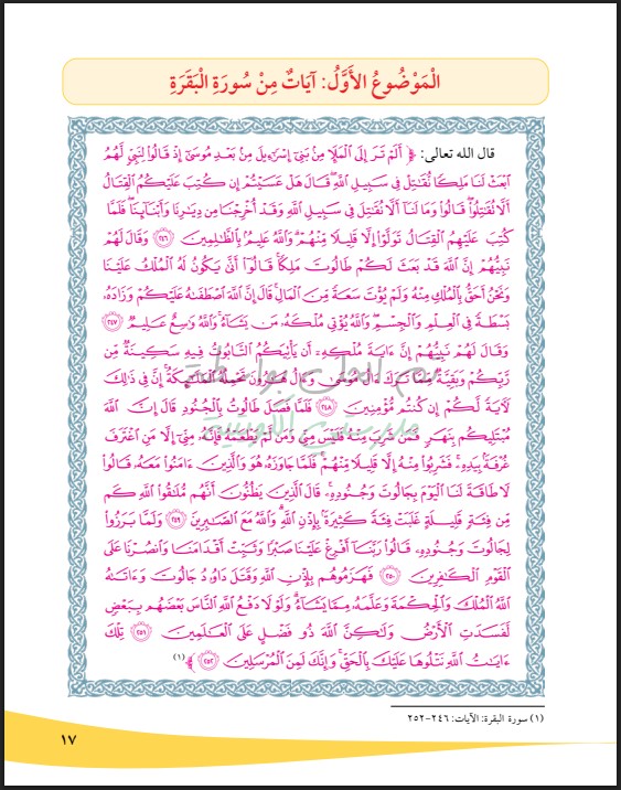 قصة طالوت وجالوت: يتناول النص الآيات التي تتحدث عن بني إسرائيل بعد موسى عليه السلام، وطلبهم مملكاً ليقاتلوا معه في سبيل الله.