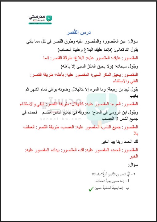 • طرق القصر: (إنما، النفي والاستثناء بـ “ما وإلا”، العطف بـ “لا وبل ولكن”، وتقديم ما حقه التأخير).